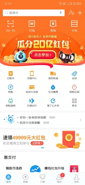 1、打开支付宝客户端,在首页进入瓜分20亿红包的界面;