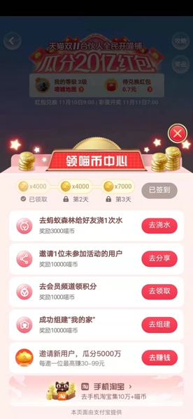 3、通过各种不同的阿里数字经济体渠道完成指定的任务就可以活动待兑换的红包,在11月10日的时候就可以兑换红包了,每个淘宝账户仅有一次兑换红包的机会。