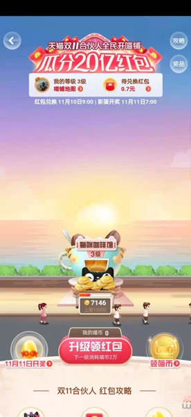 2、进入之后就可以参加领取红包的活动了,通过升级猫咪咖啡馆的方法进行领取红包,通过领取喵币来获得;