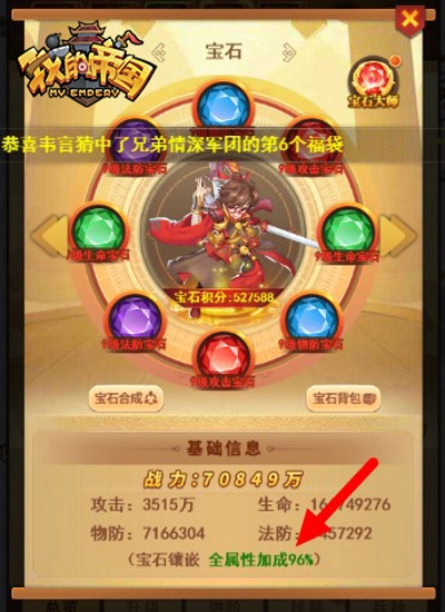 除了符文系统,游戏中的宝石系统也是增加战力的重要途径。游戏中宝石分为四种属性,按照提升战力的能力排序:攻击>生命>法防>物防。可以看出攻击是很重要的,所以我们在收集宝石时,攻击宝石必须优先考虑。宝石可合成,四个低级宝石可合成一个高级宝石,宝石等级提升到四级后,除了所对应的基础属性外,还会额外增加一个新属性:全属性比例提升,宝石等级越高,全属性比例属性提升也越高。建议资源较少的情况下,不要平均分配宝石给所有的武将,要集中优势资源打造特种部队,合成高级宝石,武装主将,这样在战斗中,你会发现主将遇神杀神,佛挡杀佛。