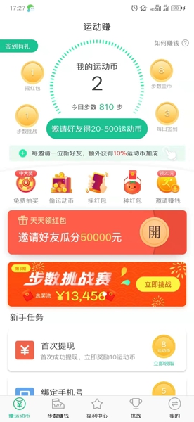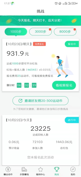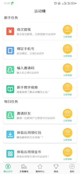 除了每天的任务之外,还可以参加官方举行的运动挑战活动,比如说步数挑战活动等等,只要每天达到相应的步数就会有着奖励,还有着邀请好友和体验应用来领取运动币哦,目前的邀请奖励是一个用户奖励500运动币,也就是五毛线,对于很多人来可能觉得很少,但是赚钱这事没有那么多的一夜暴富,只有稳扎稳打才可以砥砺前行!