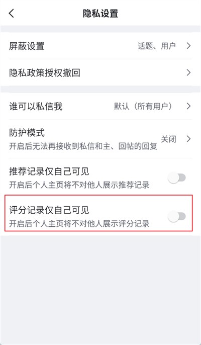 4、进入隐私设置功能界面后,点击界面上的【评分记录仅自己可见】,将后面的开关打开即可。