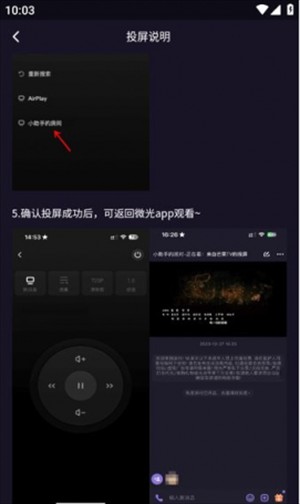 4、投屏的时候,记得打开你想投屏的APP,找到播放页面的投屏按钮(下面的箭头指着的地方),选择微光作为接收设备(这里用的是小助手的房间);