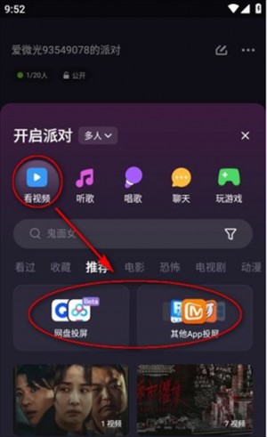2、在“开启派对”中选择“看视频”,可以在“推荐”中找到“网盘投屏(夸克/百度网盘)”或“其他App投屏(芒果tv/腾讯视频等)”;