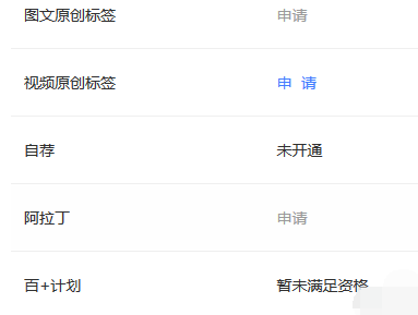 8.在诸多功能里面可以看到图文原创标签和视频原创标签,暗色的那就表明我们没满足条件不能申请,亮色的表示我们满足了条件可以申请。