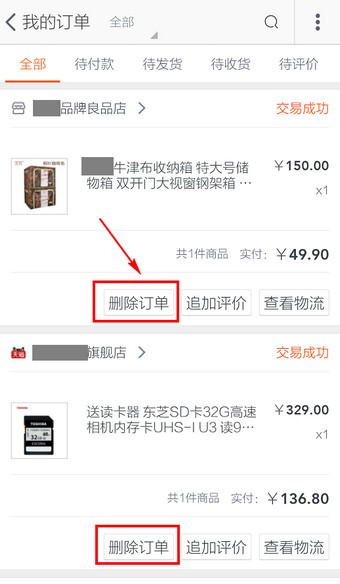 3.在每个宝贝下都有【删除订单】的按钮