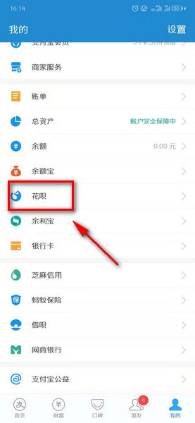 1、首先打开支付宝,点击我的—花呗进入;