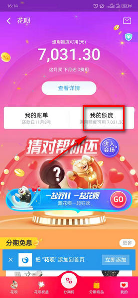 2、在花呗的界面点击我的额度;
