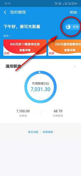 3、在我的额度中点击右上角任务(任务是不定时会出现的)