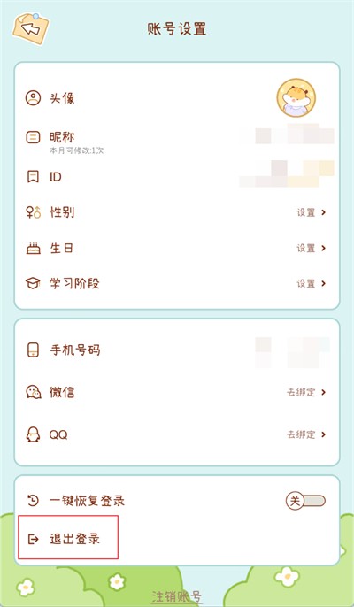 3、进入账号设置功能界面后,点击界面下方的【退出登录】选项,退出当前账号后,输入新的账号进行登录即可。