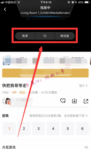 6.现在就可以用电视看腾讯视频了,如果家里有两台或更多电视,也可以换设备,还可以选择视频的清晰度,关掉投屏,注意咯!电视和手机需要连接同一个wifi哦。