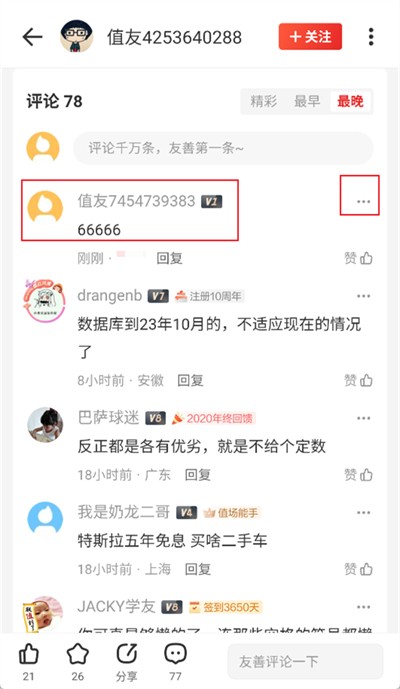 3、在评论区的位置找到自己的评论,点击后方的三个点;