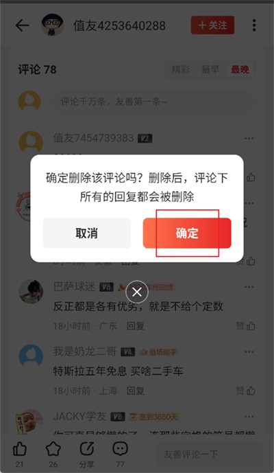 5、点击后会弹出删除提示框,点击【确定】按钮即可将当前评论删除。
