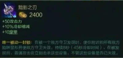 暗刃,价格:2400金币。合成的路线:锯齿短匕+长剑+长剑。