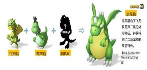 融合宠,是基于初代宠物融合而成,是外形技能双继承的完美产物,它就像是一个拥有父母最优基因的孩子,吸收了这些基因所融合出的宠物集合了参与融合的所有宠物的优点。炎龙融合自飞龙系与葫芦系,飞龙系最擅治疗,拥有短小的前肢,背后有着不断扑腾的小翅膀;葫芦系最擅长辅助,虽然不会飞,但五短身材加上蠢萌外表也让它这么一个可爱天然呆吸引到许多人的喜爱。最终形成的炎龙,既有翅膀能飞行,又有可爱呆萌的外貌,具备强力治疗能力的同时又擅长辅助,简直是完美的产物。