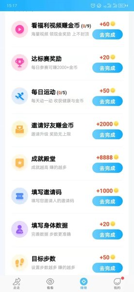 在这里有着很多的今日任务,在这里有着很多的金币任务,目前有着看视频赚金币、达标赛奖励、每日运动、邀请好友赚金币、成就殿堂、填写邀请码等等一系列的任务。