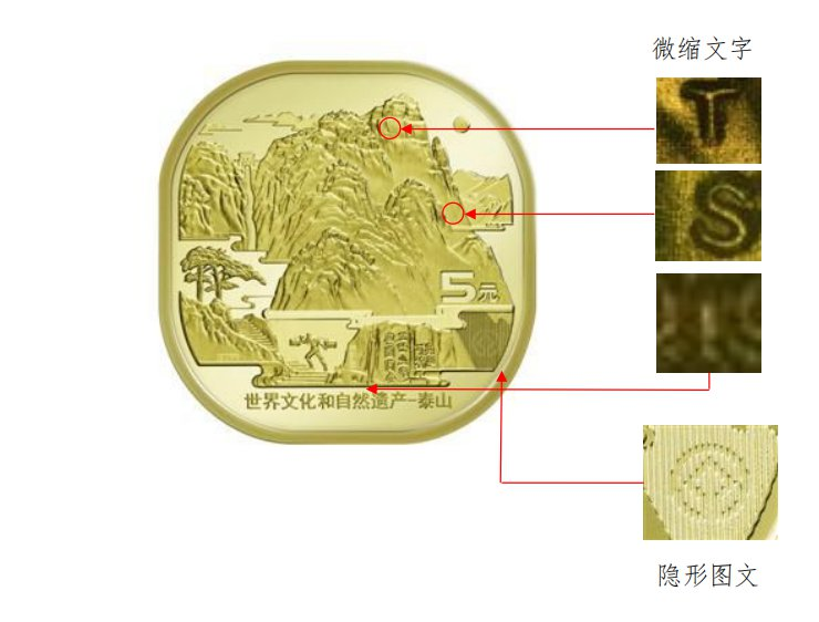 将硬币倾斜适当角度,在背面泰山图案右下方,可以观察到世界遗产标识主要素图案“