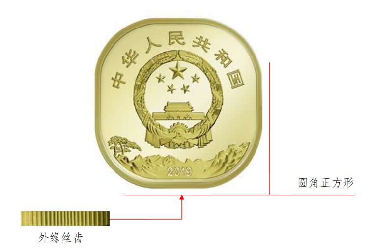 硬币外形为由四段圆弧和四段线段交替连接组成的圆角正方形。