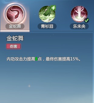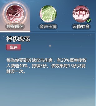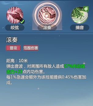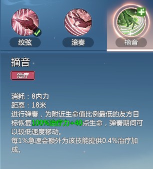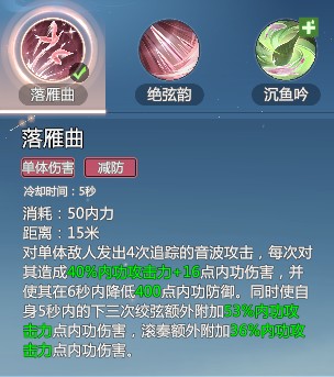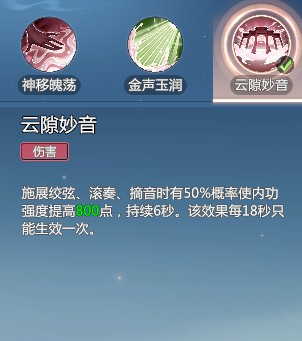 施展绞弦、滚奏、摘音时有50%几率使内功强度提高,持续6s,每18s只能生效一次