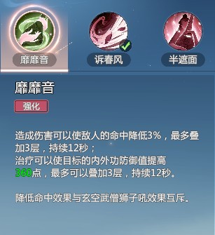 造成伤害使敌人命中降低3%,最多叠加3层,持续12s,治疗可使目标内外防提高,最多叠加3层,持续12s