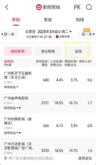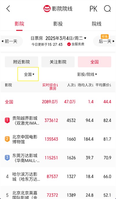 2、进入影院院线功能界面后,点击后面的【全国】;