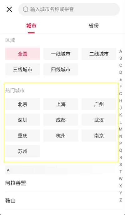 4、点击后进入城市选择界面,在这里可以选择想要查看的城市;