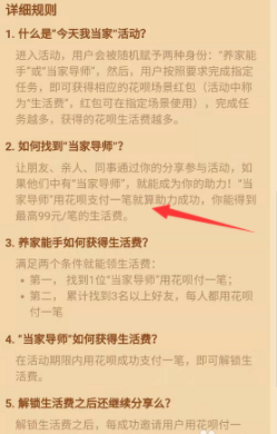 “当家导师”用花呗支付一笔就算助力成功,你能得到最高99元/笔的生活费。