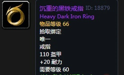 沉重的黑铁戒指:戒指2,出自熔火之心副本萨弗隆先驱者,鲁西弗隆,基赫纳斯,沙斯拉尔均可掉落,无法附魔。