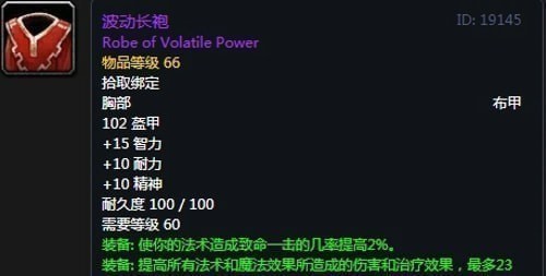 波动长袍:胸甲,出自熔火之心副本萨弗隆先驱者,鲁西弗隆,基赫纳斯,沙斯拉尔均可掉落,推荐附魔强效属性。