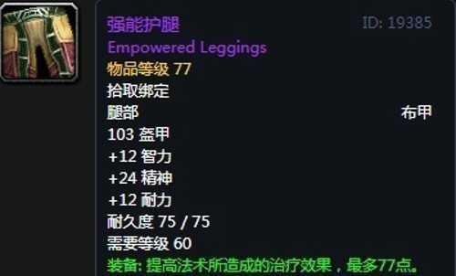 基础属性:103护甲,+12智力,+12耐力,+24精神,装备效果提高法术所造成的治疗效果,最多77点,使你的法术造成爆击的几率提高1%。