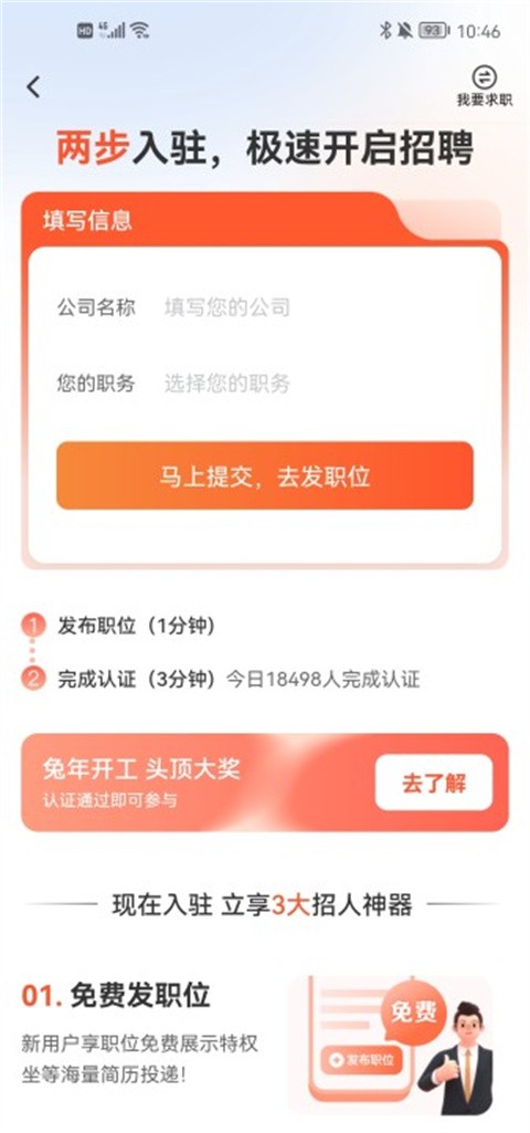跳转到新的页面后,填写公司名称和你的职位,点击页面里的【马上提交,去发职位】。