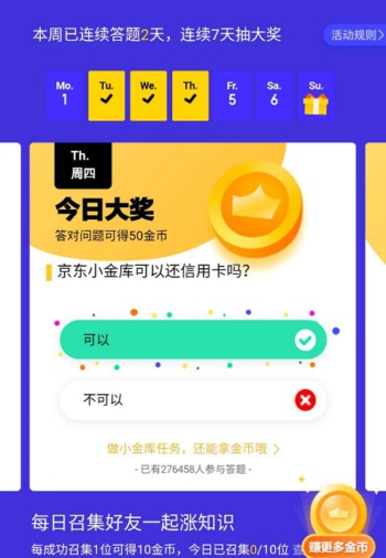 用户只需打开京东金融,在每日签到界面进入答题领金币,选择答案就可以获得今日份金币哦,连续7天还能抽取大奖,小伙伴们赶紧去试试吧!