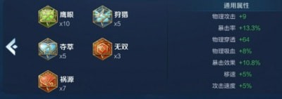 铭文推荐:十个绿色的鹰眼,七个红色的祸源,三个红色的无双,五个蓝色的狩猎,五个蓝色的夺萃。