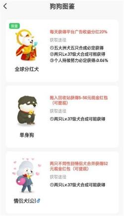 5.通过狗狗合成,获得全球分红犬、单身狗和情侣犬等等都能获得不同的现金红包奖励。如图下: