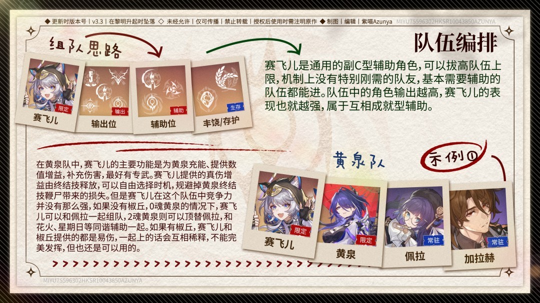在黄泉队中,赛飞儿的主要功能是为黄泉充能、提供数值增益,补充伤害,最好有专武。赛飞儿提供的真伤增益由终结技释放,可以自由选择时机,规避掉黄泉终结技鞭尸带来的损失。但是赛飞儿在这个队伍中竞争力并没有那么强,如果没有椒丘,0魂黄泉的情况下,赛飞儿可以和佩拉一起组队,2魂黄泉则可以顶替佩拉,和花火、星期日等同谐辅助一起。如果有椒丘,赛飞儿和椒丘提供的都是易伤,一起上的话会互相稀释,不能完美发挥,但也还是可以用的。