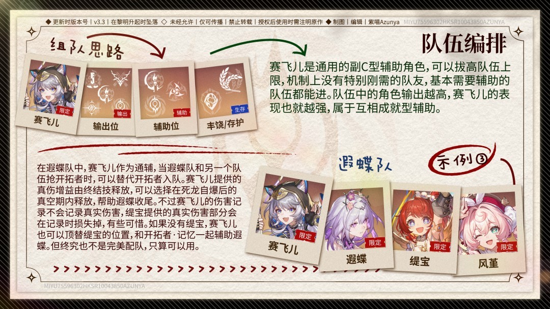 在遐蝶队中,赛飞儿作为通辅,当遐蝶队和另一个队伍抢开拓者时,可以替代开拓者入队。赛飞儿提供的真伤增益由终结技释放,可以选择在死龙自爆后的真空期内释放,帮助遐蝶收尾。不过赛飞儿的伤害记录不会记录真实伤害,缇宝提供的真实伤害部分会在记录时损失掉,有些可惜。如果没有缇宝,赛飞儿也可以顶替缇宝的位置,和开拓者·记忆一起辅助遐蝶。但终究也不是完美配队,只算可以用。