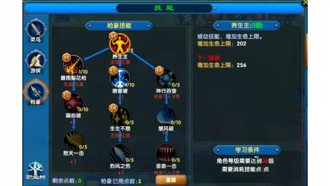养生主加5点、暴雨梨花枪加10点、生生不息加5点,这三个技能必须无脑拉满。养生主增加生命值上限,生生不息增加恢复效果,暴雨梨花枪是主要群攻伤害技能。神行百变、舍命一击根据个人看法进行加点,前者增加枪豪闪避概率,后者通过消耗生命换取攻击力。其余技能加一点即可。也可根据自身喜好选择加点,例如怒天一击以及烈风之伤可以选择不学习,因为技能释放后会给枪豪带来一定Debuff。以上枪豪必加技能总共消耗44技能点,其余技能点玩家可根据自身喜好分配。