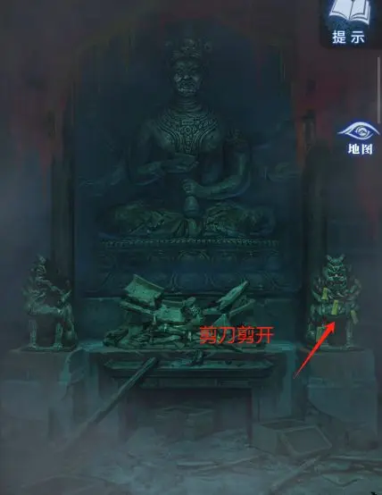 9、在去奉奘祠:对奘尊雕像的右侧使用【红剪刀】,触发小游戏,按照 “上下右下左上” 移动中间的滑块,完成后获得【三炷香】和【完整的尺子】。