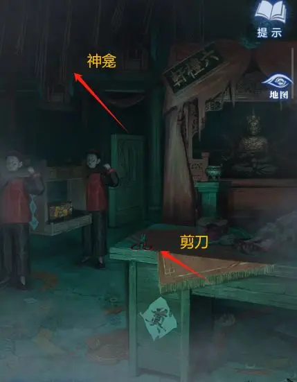 1、点击纸人庙上的牌匾,获得【龙凤花烛】;点击窗户,获得【朱砂香囊】,同时注意许愿牌的位置和上面的图案。