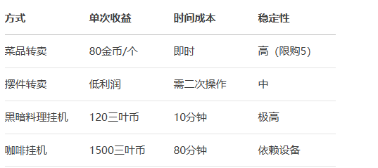 推荐参与三叶币稳定获取活动,如制作黑暗料理(10分钟/120币)或咖啡挂机(80分钟/1500币)3。