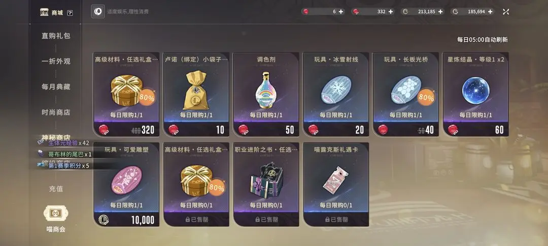 神秘商店必买物品包括顶级材料、职业进阶之书、喵礼遇卡、复活糖和各类结晶,高级材料可根据需求选择性购买。