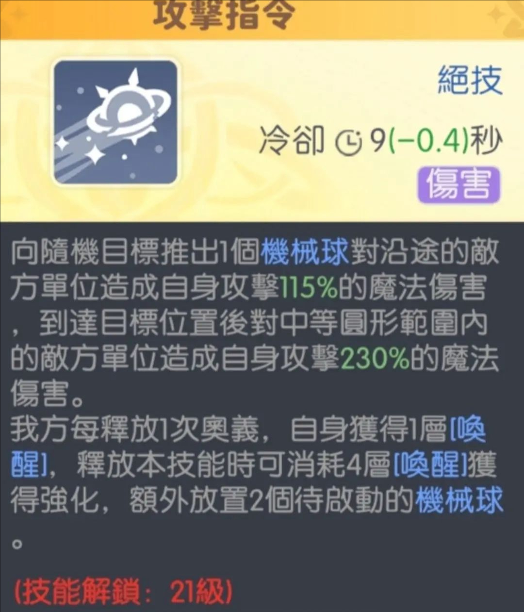 在奥术队中,青铜神姬可召唤更多机械球,提升输出能力。自身奥义点最多可降低两费,无需担忧抢炎魔奥义点,带圣杯放后排奥义最低可变为一费。每有一个机械球可回复20%怒气,激活机械球攻击,在奥术队中怒气积攒迅速,开出奥义即可轻松回满。提升到钻石段位后,开局可为炎魔奥义减冷却(需炎魔带急速套或急速高于队友),让炎魔开局释放奥义,减冷给奥法可实现开局沉默,即使海神开局风也能沉默。充能指令对自己有效,可频繁打出奥义伤害并回复怒气。防御指令也能给自己,增加暴击率,提供怒气回复与护盾,解决奥术队怒气回复难题。