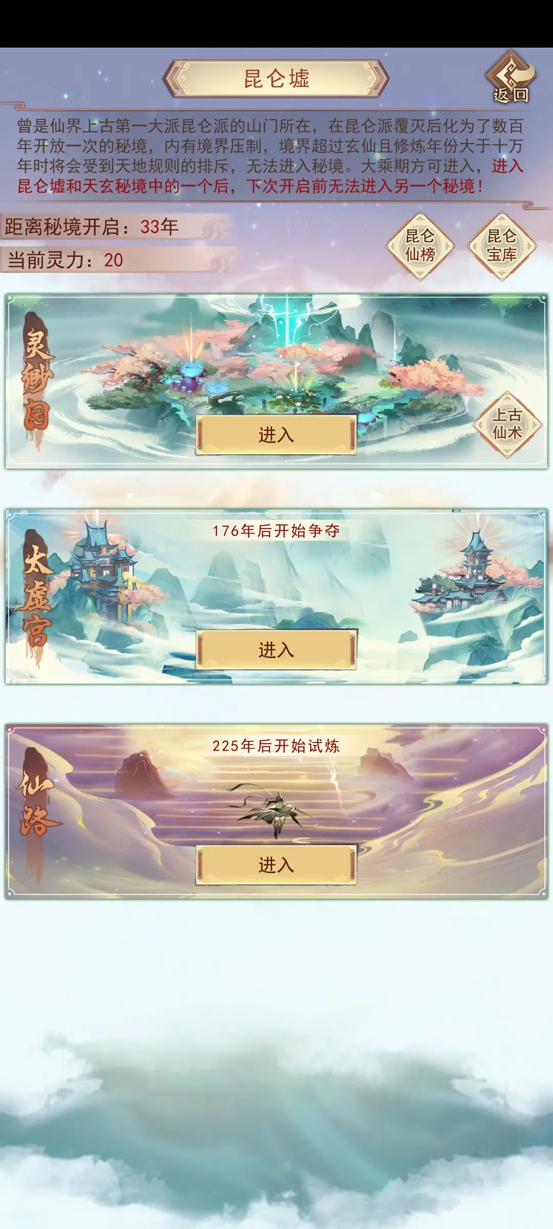 每周五至周日开放灵缈园。每日可获得20点灵力,每次探索消耗2点灵力。注意不要误入天玄秘境。