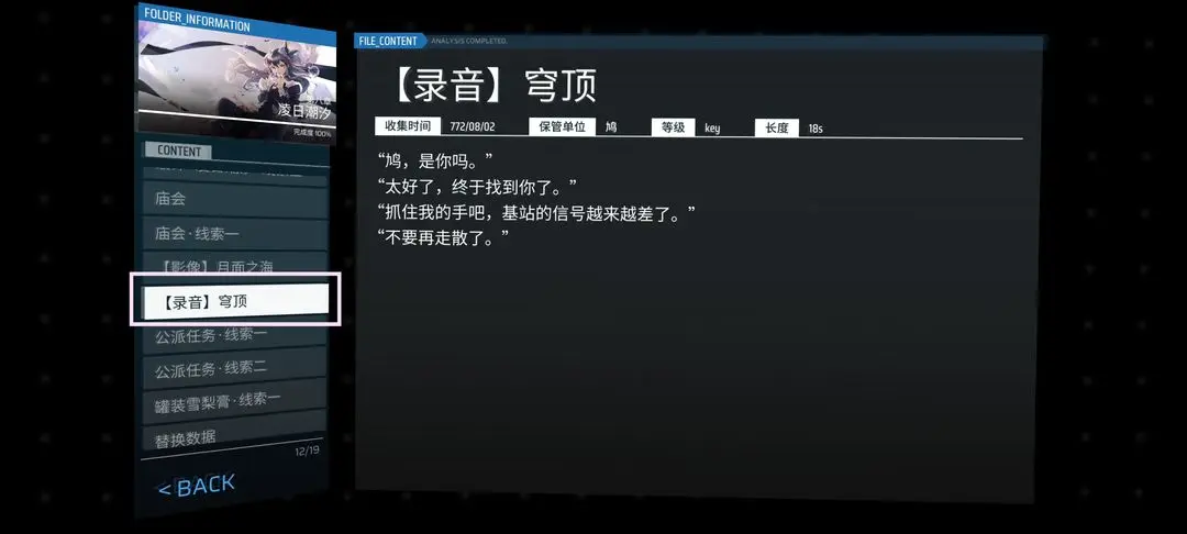 共19个收藏品,包含1个特殊收藏品"【录音】穹顶"。需通过"Distorted Fate"任意难度获取,无分数要求可放置刷取。