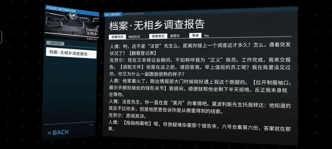 仅1个收藏品"档案·无相乡调查报告"。需先完成1-3支线所有曲目Cleared状态后必掉。