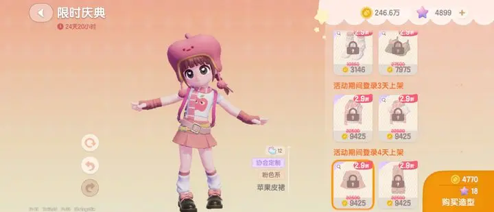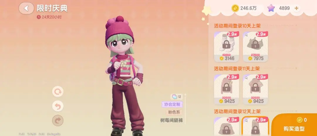 进入活动商店后,使用金币或满愿星购买部件,每日登录可解锁2个新部件,累计登录12天可集齐全部时装。