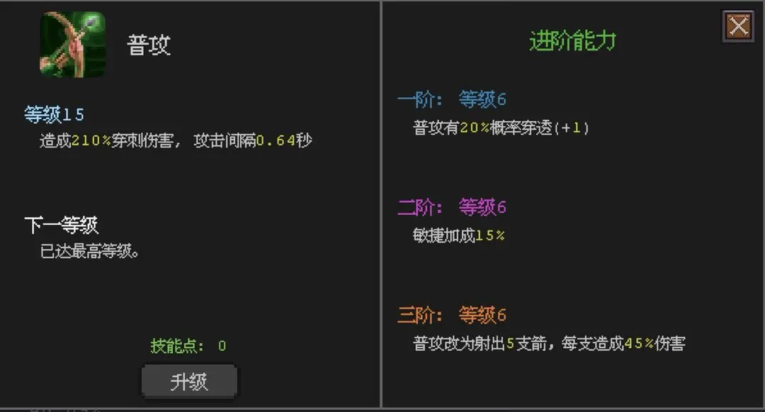 基础15级普攻技能提供210%穿刺伤害,配合三阶进阶效果的5支45%伤害箭矢,实际单次普攻总伤可达472.5%。四转后箭矢数量提升至7支,理论伤害增至661.5%。五转的距离加成机制使最终伤害在1-2.5倍区间浮动,经实战测试平均加成为1.75倍,使得五转神鹰的常态普攻伤害稳定在1157.6%左右。