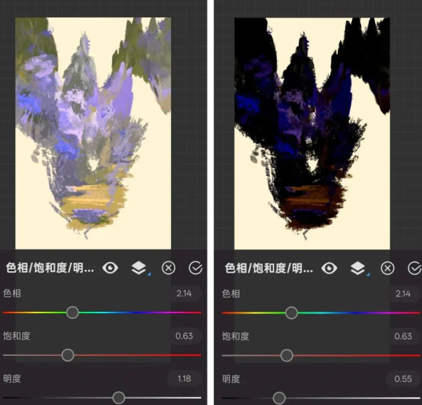 明度控制整体明暗变化。右调增强画面亮度,左调降低亮度实现暗化效果。