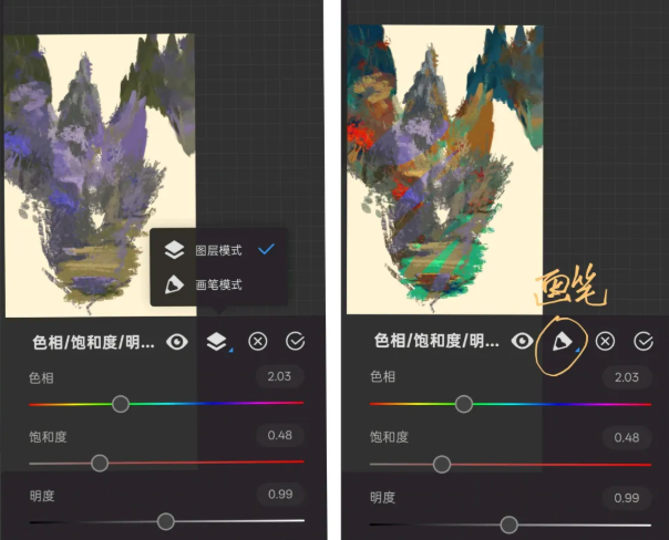 提供图层模式(整体调整)与画笔模式(局部调整)两种应用方式,满足不同编辑需求。