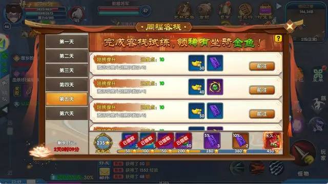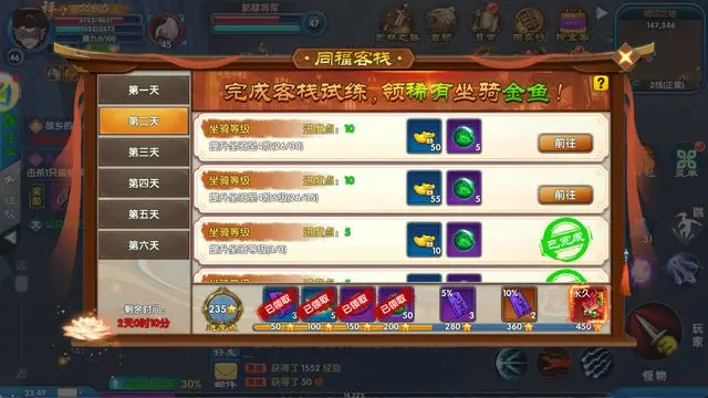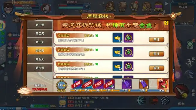 开服后连续六天,每日将解锁一系列客栈专属任务。玩家完成相应任务,即可获取传说级坐骑 “金鱼”。该坐骑不仅外观独特,移动速度更达 5.5,为开荒冲级的核心助力道具。
